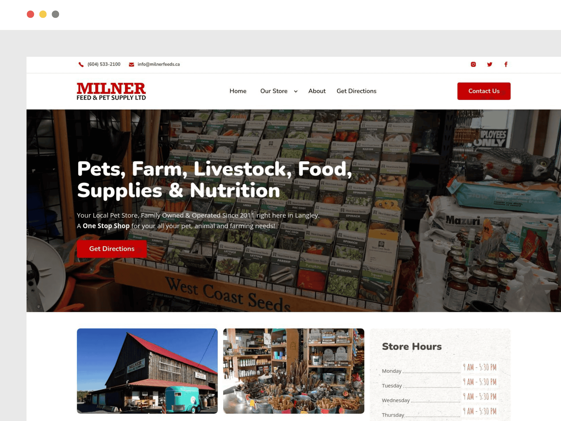 Milner Feed & Pet Supply, a cherished local pet store with a rich heritage in Langley and a long-term client of ours, needed a website refresh. They aimed to enhance the customer experience by more effectively answering questions, showcasing the store, and increasing organic traffic with optimized SEO to connect with more customers.